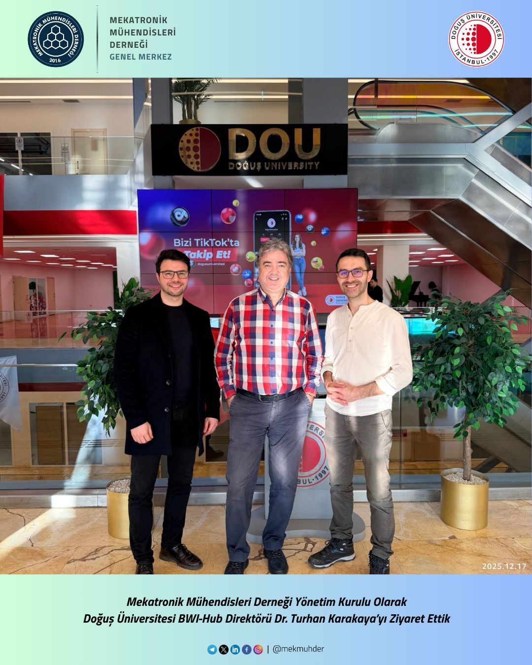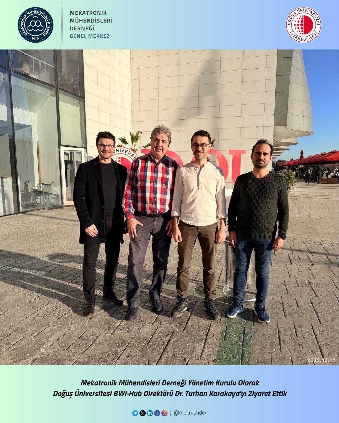 Mekatronik Mühendisleri Derneği (MEKMÜHDER) heyeti, Doğuş Üniversitesi İş Dünyası ve İnovasyon Merkezi (İnovasyon Hub) Direktörü Dr. Turhan Karakaya’yı makamında ziyaret ederek, akademi-sanayi iş birliği ve robotik projeler üzerine kapsamlı bir görüşme gerçekleştirdi.